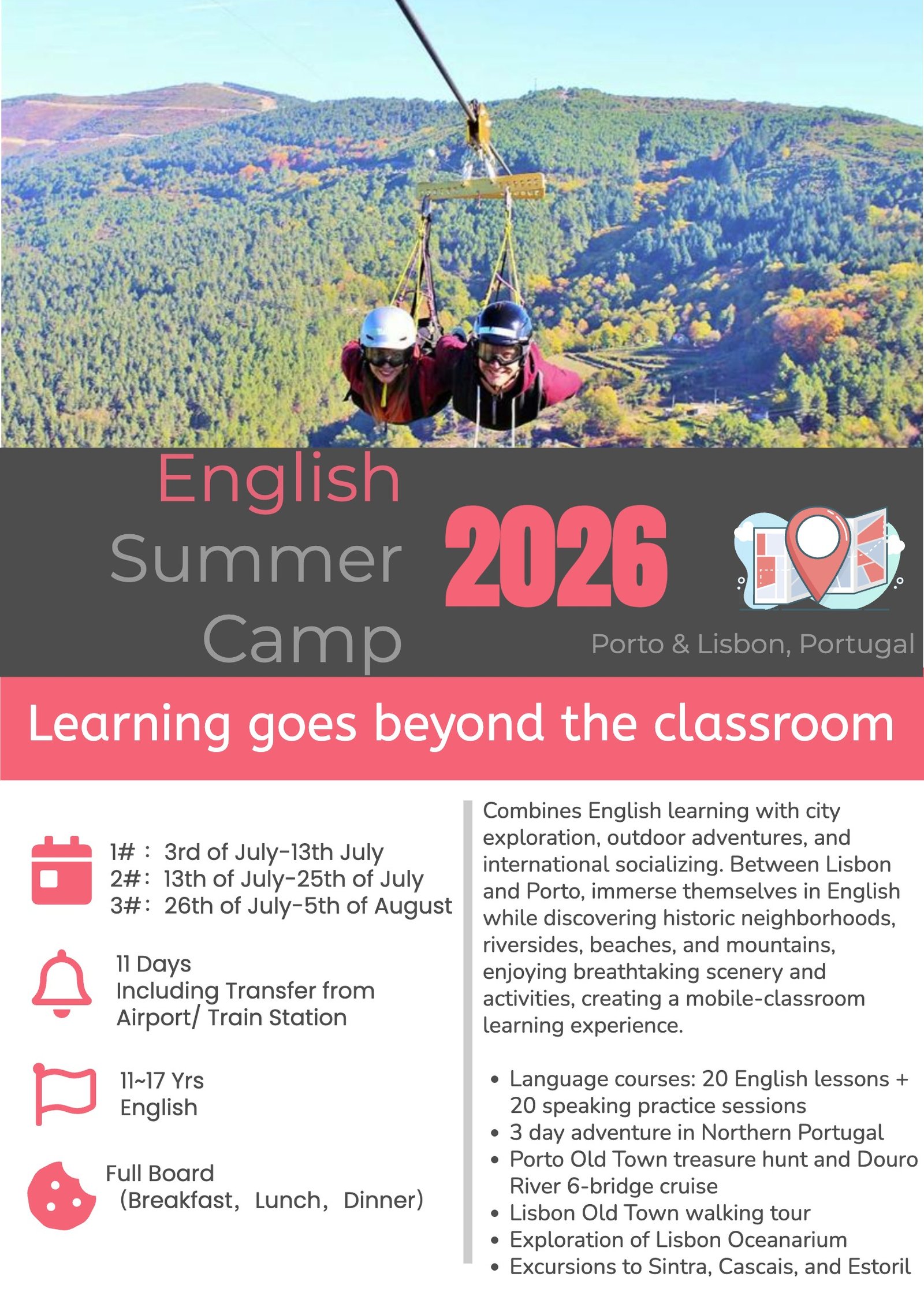 The camp is designed for young students, 11-17 years old and offer to children a unique opportunity to experience all aspects of Porto and Lisbon and surroundings, such as the beautiful sandy beaches and exciting nature on high mountains!